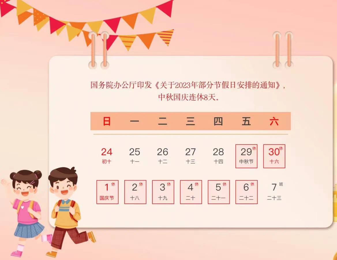 本次放假时间为2023年9月29日至10月6日,共计8天。