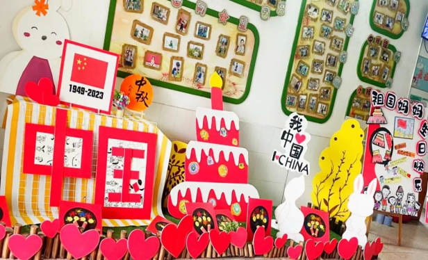 幼儿通过分享品尝、手工制作、绘画涂色、说说唱唱等方式积极参与到中秋主题活动中,与小伙伴共同体验中秋佳节团团圆圆、其乐融融的节日氛围;在这个举国欢庆的热闹节日里,幼儿用一双双巧手为祖国妈妈的生日献礼,他们制作了漂亮的中国地图、爱国手环等等,庆贺祖国74岁华诞,在此过程中激发了幼儿的民族自豪感和热爱祖国的意识,让一颗颗小小爱国心悄然发芽。