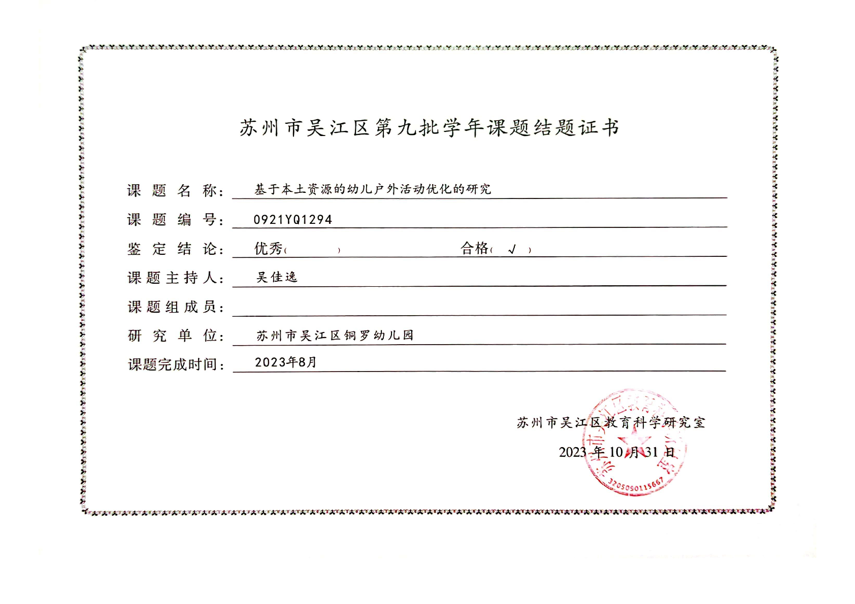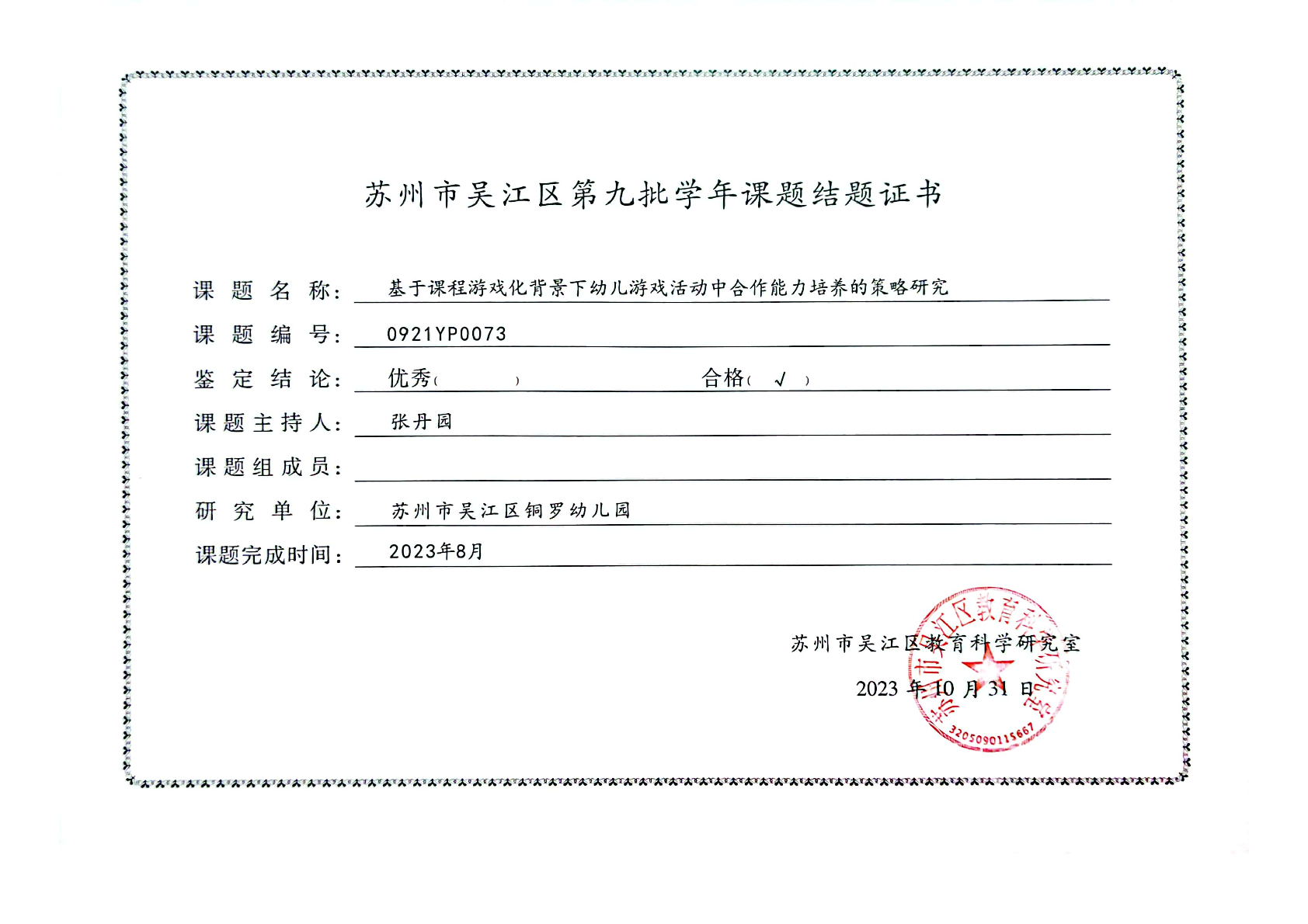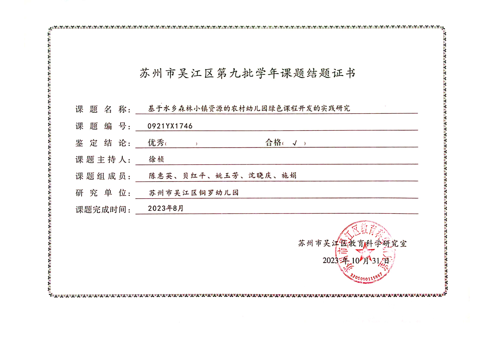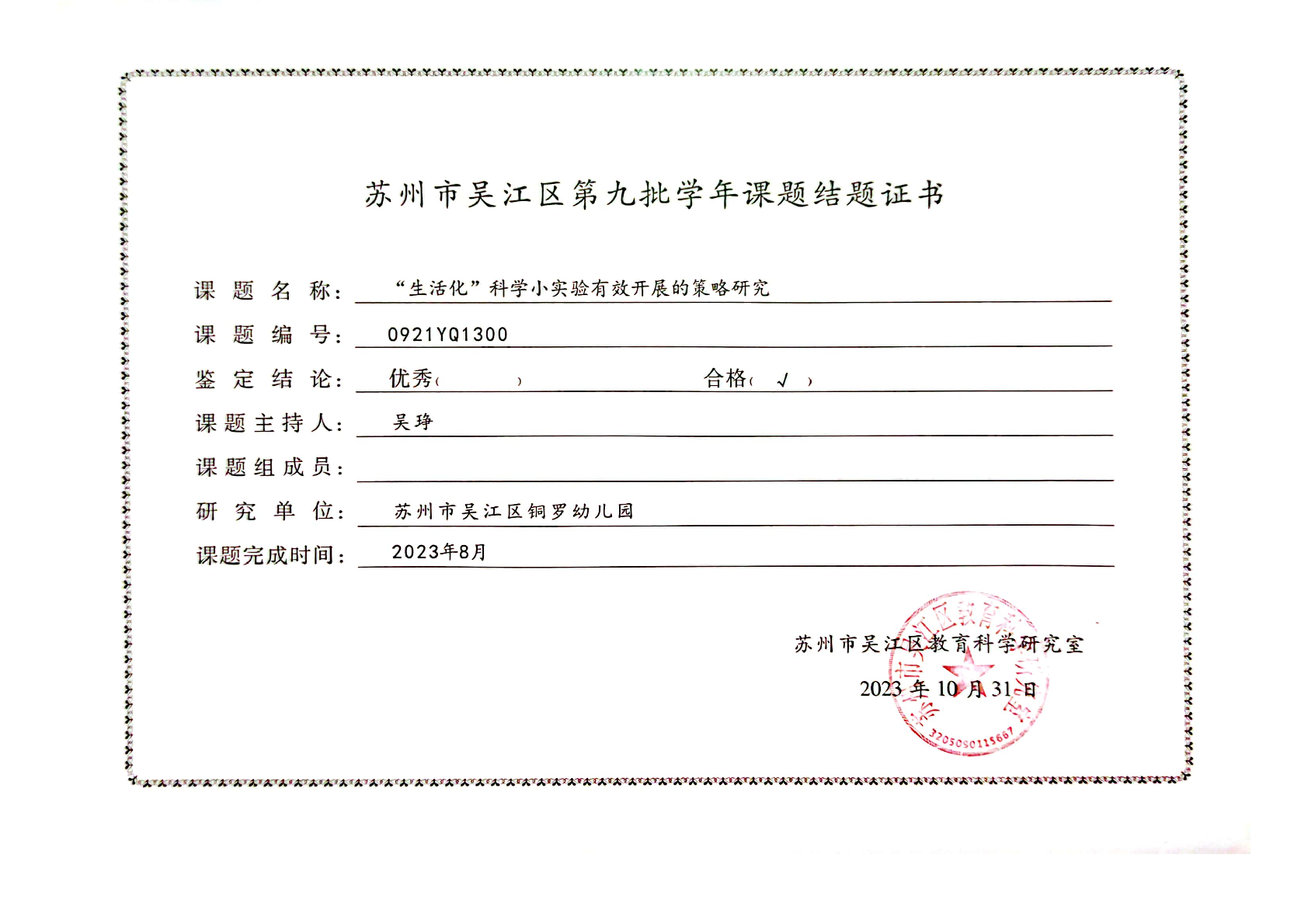 课题研究是教育科研的重要载体,是幼儿园不断革新、积淀成果、提升品质的重要核心工作。学年课题研究能更聚焦教育教学工作中的实际问题,进一步加强教师的教科研能力,在区第九批学年课题研究期间(2021年9月至2023年8月),教师们积累经验,梳理资料,进行交流和共享,幼儿、教师都获得了成长。本次课题结题工作已顺利完成,1项学校专项课题、7项青年教师专项课题、2项普通学年课题都已顺利结题。